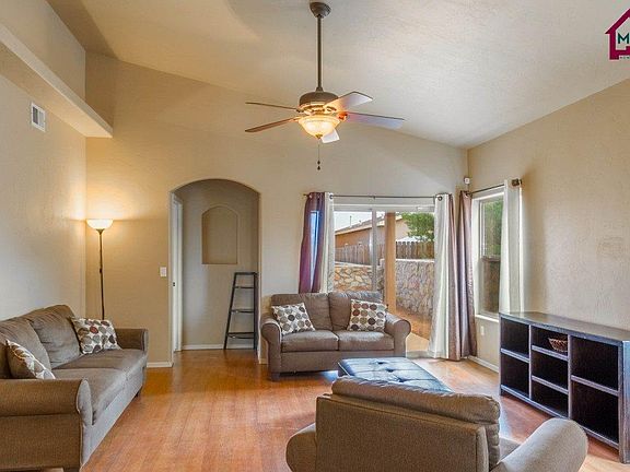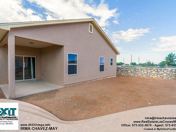 4943 Ortega is an adorable 3 bedroom 2 bath home with 1,489 sq ft. This split floor plan home has gorgeous wood laminate floors in living room and elegant earth-tone colored ceramic tile throughout the rest of the home. The living room has access to a spacious covered back porch, just the right size for a BBQ grill & outdoor dining set. The kitchen includes a breakfast bar, pantry, a Samsung- 3 door refrigerator & the gas stove/oven, microwave and dishwasher are all Whirlpool appliances. The Master bedroom has room for a bed, lots of furniture and a desk or office area. Master bath includes double sinks, garden tub w/glassblock window & separate shower. The kitchen & bathrooms have luxurious Granite counter tops. Includes a formal dining room, alarm system, coded key entry, 6-stage Reverse Osmosis & refrigerated A/C. The front outdoor sensor lights automatically turn on at night & off during the day. This homes shows pride of ownership and looks new! Call Irma Chavez-May at 575-635-1113 to view today.