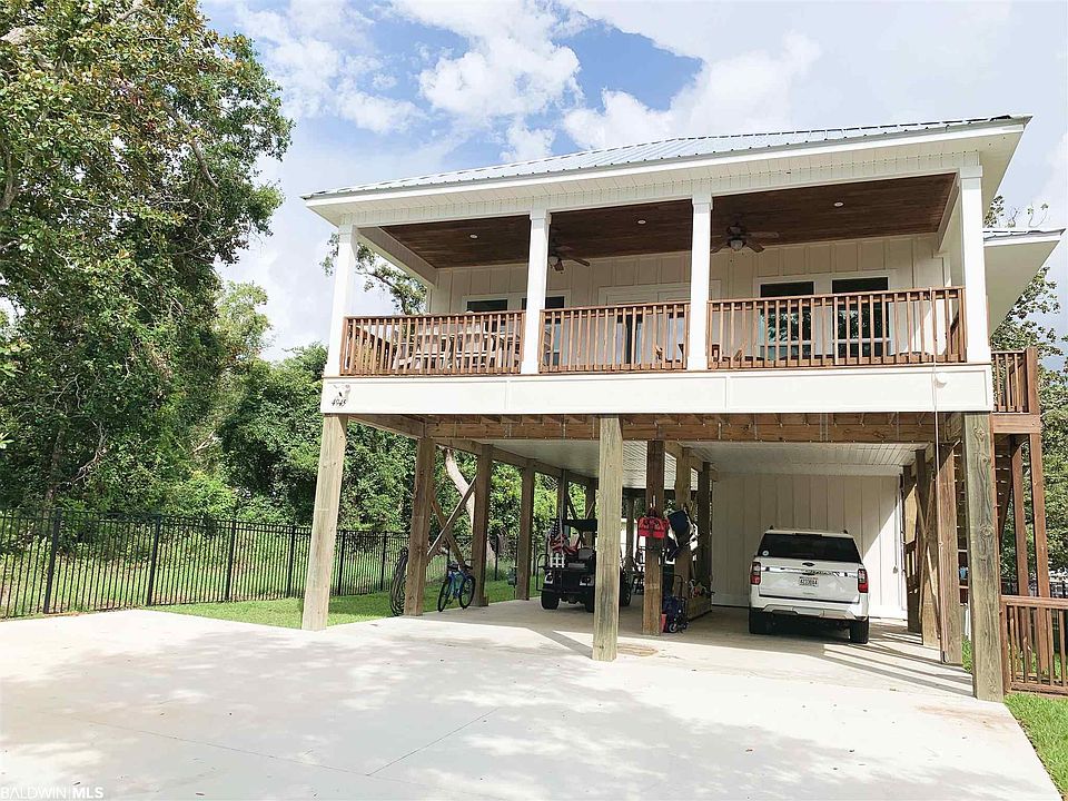Amazing, custom 4 bedroom 4 bathroom home in Orange Beach. 2,100 square feet living area. This Gold Fortified home has exceptional amenities. Features Include: Spray foam insulation, 10.5 foot pilings, beautiful front and back porches, gas appliances, knotty pine shiplap walls in entire home, quartz countertops in kitchen and all bathrooms, extra large master closet and luxury flooring throughout. In addition to the three bedrooms and three baths on the main level, there is an additional guest suite downstairs with private bath and entrance. The home is situated on a very large elevated lot that is not in a flood zone. Outdoor amenities include a fully fenced yard with driveway gate, custom Aquavator cargo lift/elevator, storage shed, and a hot/cold outdoor shower. There is also a 30 amp plug installed on the house for a generator. New metal roof installed July 2021. Beautiful water views from front and back porches. Additional amenities include neighborhood boat launch and deeded access to a separate waterfront lot. **Measurements, dimensions and any other information deemed important to be verified by buyer and/or buyer's agent.**