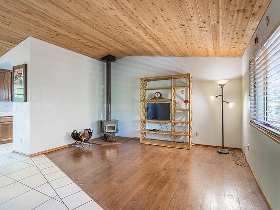 Feel cozy in the living room with the beautiful high wood ceilings and the cozy warm woodstove.