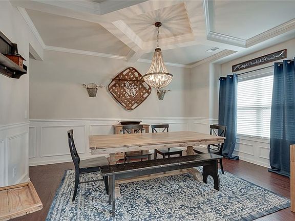 Hurry! Sprawling open-concept design with upgrades galore! Welcoming two-story foyer flooded with natural light. Spacious separate dining room with coffered ceiling and wainscoting. Separate living room makes ideal home office and features bayed window and custom built-in bench seating complete with storage. Fireside family room with trey ceiling overlooks designer kitchen with on-trend white cabinets, subway tile backsplash, granite countertops, stainless steel appliances, upgraded drawer hardware and lighting, pantry, island, and plenty of counterspace for prep and serving. Oversized breakfast area easily fits 8- person table. Bedroom and full bath complete with granite and tile rounds out main level. Hardwood floors throughout main level, no carpet. Lots of windows let natural light in and overlook large, fenced, backyard backed up to wooded area for privacy. Upstairs boasts master bedroom with vaulted ceiling and en suite with dual vanity, granite, separate shower, walk-in closet, and tile. 3 additional bedrooms up are all generous in size. Full bath up with granite and tile upgrades. Flex room up is ideal for media, play, or workout space. Upstairs laundry room is large and convenient. Covered patio in backyard is ideal grilling spot. Sought after swim/tennis neighborhood.