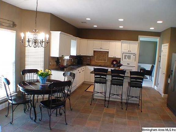 This is a spectacular two story home in sought after Oak Meadows Subdivision. You'll love the convenient location & the excellent Oak Mountain Schools ranked among the top in Alabama. The exterior boasts of beauty and displays professionally landscaped flower beds in both front & rear yards. The three sides brick & vinyl home is accented with limestone accents over the windows. The entire yard has a sprinkler system & huge privacy fence. The main level has a large 2 car garage which is a real plus. The interior has 2 decorative stair cases, huge 2-story foyer with designer ceramic tile flooring. Adjacent to the foyer is the over sized living room that is large enough to entertain any sized party. The kitchen is a chefs dream, filled with granite counter tops, island oasis, and desk area. From here you have a full view of 2-story great room. Upstairs are 4 very large bedrooms and master suite that will make you feel as though you are on vacation every night!!