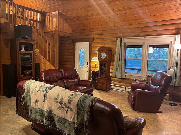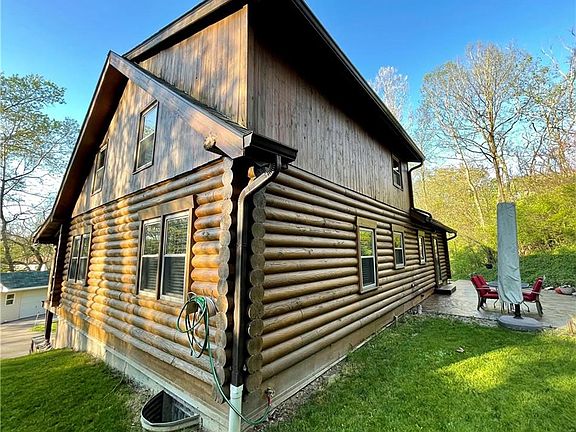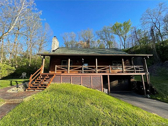 Your very own log cabin retreat awaits you! The full length covered front porch invites you to sit awhile. Inside you'll find soaring ceilings, an open floor plan, and a master suite upstairs in the loft. Two bedrooms on the main level with a full bath. New LVT in the living area and kitchen. The two car garage leads you right into the full finished basement featuring a second wood burning fireplace, freshly updated half bath, laundry area, and storage. This home is convenient to everything yet secluded on a wooded lot that makes you feel like you're on a vacation in the mountains. The back patio provides your own private oasis. Out front you'll find a storage shed, garden area, and plenty of room to run and play. There's even a stream running along side the property. Gorgeous! The chair lift can stay or taken out upon request. Come and take a look at this very unique property today!