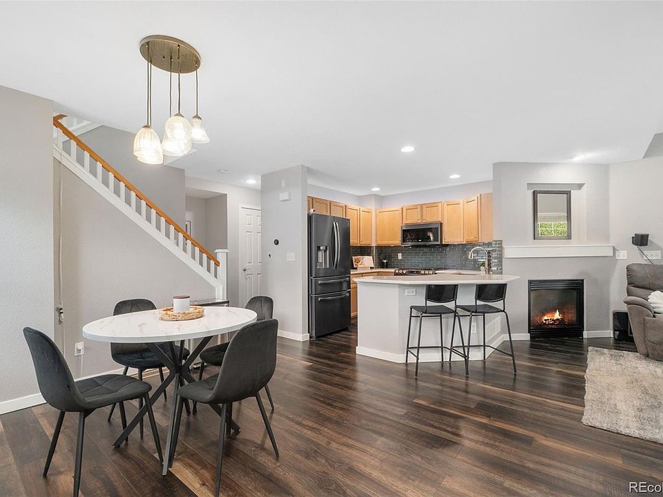 A classic white picket fence, lush landscaping, and a cozy covered porch set the inviting tone. Step inside to discover vaulted ceilings, abundant natural light, and rich wood-style flooring throughout. The open living area centers around a warm gas fireplace and flows effortlessly into the updated kitchen, featuring quartz countertops, subway tile backsplash, gas range, and bar-top seating—perfect for morning coffee or casual entertaining.