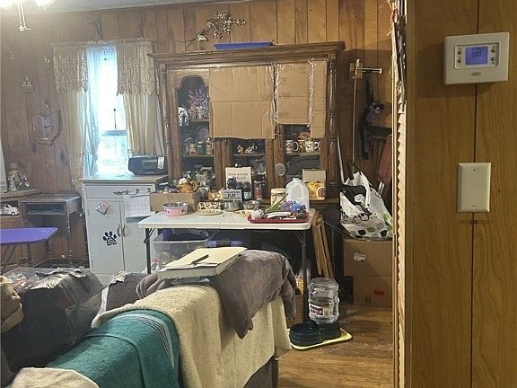 This cozy two-bedroom frame home sits on four lots equaling one acre. The large detached garage is great for extra storage. The home has two bedrooms an open living room and a kitchen area. Covered front porch is great for sitting and enjoying nature during the warmer months.