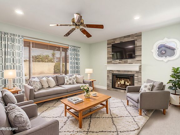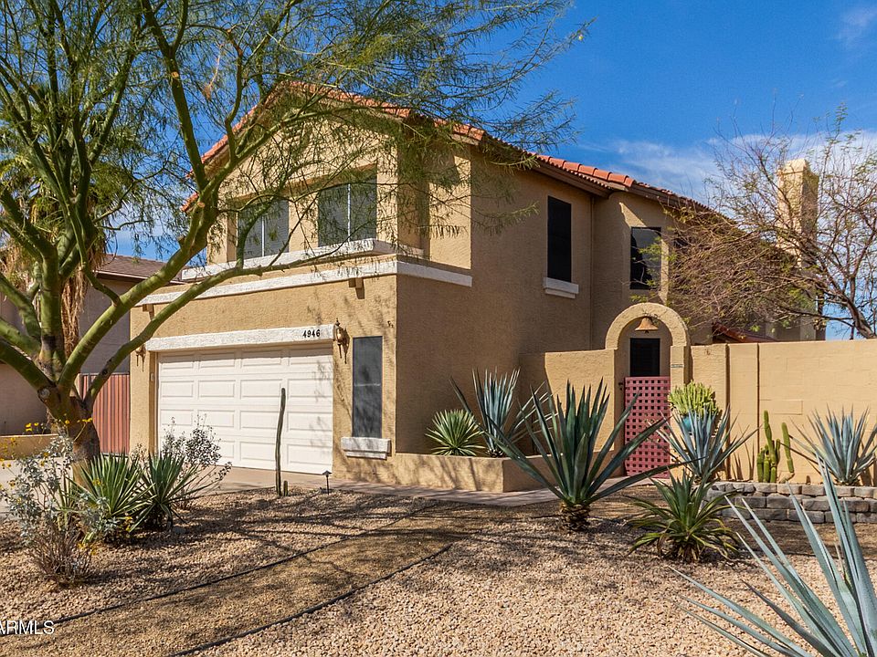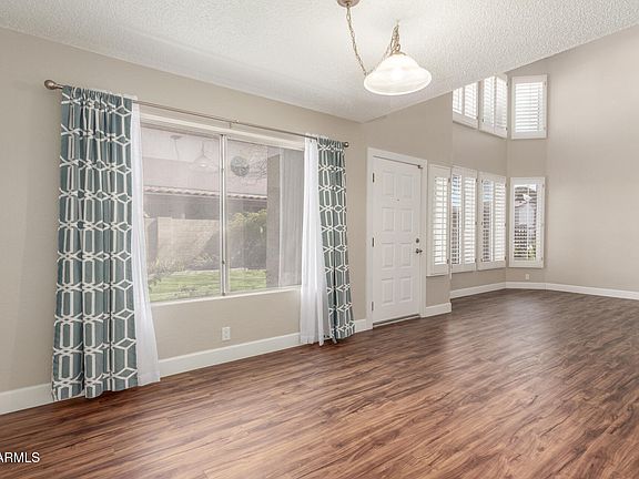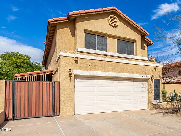 4 Bed/2.5 Bath with gated front courtyard with beautiful pool, patio and charming landscaping. Entry into living room with soaring ceilings, dining room. Updated kitchen with newer cabinets, quartz counters, island and updated appliances. Family room with fireplace and exit to back patio. Powder room downstairs. Split bedroom floorplan upstairs. Primary bedroom balcony is great for morning coffee. 2-car garage. Convenient to ASU West, freeways, shopping.