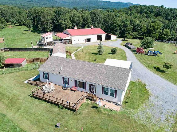 60.5 acres of fertile hay ground and mixed hardwoods complete with trails throughout, creek and large stocked fishing pond. Improved by a high end ranch home built in 2013 1860 sq ft 3 bed 2 bath with Gourmet Chefs kitchen & large rooms. Additional single wide home 2 bedrms 1 bath manufactured home with special use permit for farm help/elderly care also on property for a total of 5 bedrms 3 bathrooms. 48x80 Stable and barn complete with living quarters including laundry facility & 4th full bathroom. Stable office with views of entire farm, fenced runs for separating & grading livestock. Concrete 28x50 feed barn, large 30x46 hay storage and much more. Spectacular Eastern Rockingham county location with panoramic views and abundant wildlife