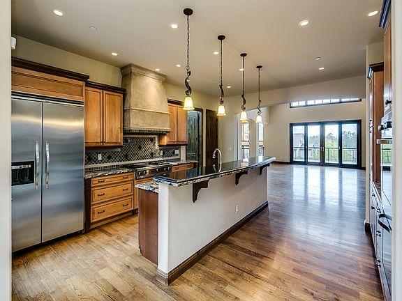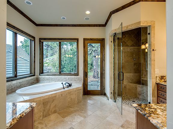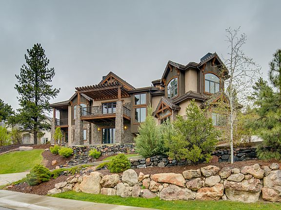 Grand mountain contemporary home feels like a vacation lodge. Large lot with mountain views backs to open space. Great room sports hardwoods, vaulted ceiling, and floor-to-ceiling stone fireplace banked by built-ins. Enjoy fresh air on roomy terrace with stone pillars and wooden pergola, or private patio surrounded by nature views. Gourmet kitchen features granite, stainless and hardwoods, plus a quartet of pendant lights over working island with serving bar. Large eating nook has oversize windows on 3 sides. Master suite has gas fireplace with tile surround and handsome wooden mantle, and French doors to master terrace. Huge walk-in closet has 3-paneled dressing mirror and built-ins. Five-piece master bath features steam shower, jet-action tub and his-and-hers vanity stations. Tremendous rec room lets you host any occasion, with full-service wet bar and wine cellar with stained-glass door. Each bedroom suite has private bath. Plenty of room for nanny or in-laws. Luxury throughout.