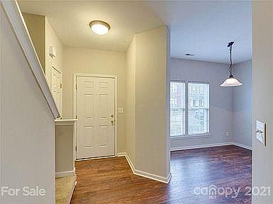 Fantastic townhome set in Eastern Charlotte just minutes away from University of North Carolina Charlotte's (UNCC) campus, Concord Mills Shopping Center, PNC Music Pavilion, and much more. A quiet community houses this interior unit with many amazing features inside. 2 Large bedrooms, each with their own full private bathrooms attached, allow for shared living or extra space for visiting guests. Ceiling fans, walk-in closets, and tons of space in each room. Carpeted second floor living spaces with Hardwood throughout the first level. Natural light passes through the home with windows and sun from front to back. Dinning room directly off the kitchen and a breakfast bar for casual meals. Matching black appliances with dishwasher and glass-top electric range. Water, Sewer and trash collection covered/included with Rent, as well as access to Community Pool within walking distance of home. Back slab patio with backdoor entry from rear parking spaces. Washer and Dryer hooked up and ready. Do not miss out on this unassuming steal of a deal.