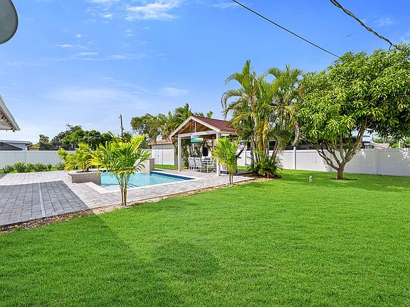 Experience the best of Naples living in this beautifully maintained single-family home offering southern exposure, a new heated saltwater pool with a waterfall feature (2023), and a spacious gazebo perfect for relaxing or entertaining. With no HOA fees or restrictions, this property provides exceptional freedom and convenience in a desirable Golden Gate City location close to schools, parks, shopping, dining, and just 15-20 minutes from downtown Naples and the beaches. The inviting layout features three bedrooms and two bathrooms, with one of the guest rooms converted from a garage into a versatile suite complete with a kitchenette, sink, and overhead cabinetry, ideal for extended family or guests. Inside, diagonal tile flooring flows throughout the main living areas, creating a cohesive and easy-care design. The cozy living room features a window that fills the space with natural light and a modern ceiling fan for comfort. The kitchen is well-appointed with shaker-style cabinetry, sleek modern countertops, and appliances, including a range, microwave, dishwasher, and refrigerator with icemaker. An adjacent formal dining area with sliding glass doors opens to the back patio, providing effortless indoor-outdoor living. The owner's suite is a peaceful retreat with a walk-in closet and an en-suite bath featuring a modern vanity and shower-tub combination. Two additional guest bedrooms share an updated bath with a walk-in shower, offering ample space and privacy for family or visitors. Step outside to your own private oasis. The fully fenced backyard showcases updated landscaping and a patio with brick paver flooring. The sparkling saltwater pool and gazebo create an inviting setting for outdoor enjoyment year-round. Additional updates include a newer roof (2020) and a washer and dryer. Located in Flood Zone X, this home offers lower insurance costs with no flood insurance required, making it an exceptional opportunity for both comfort and peace of mind.