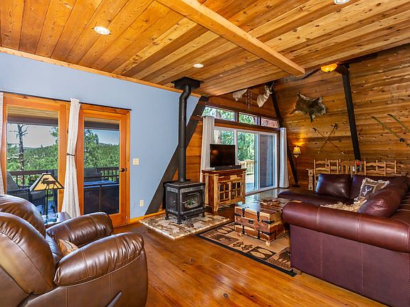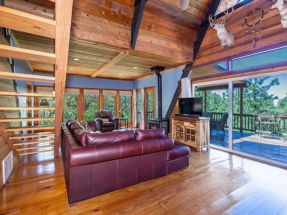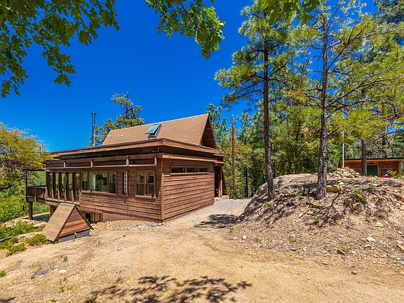 This immaculately maintained cabin in the pines, sits right outside Prescott National Forest on 1.85 acres, near Goldwater Lake, close to hiking and mountain biking trails. Live on one level and have guests stay in the upstairs loft enjoying amazing views, or in the cozy hideaway sleep loft off the kitchen. White fir tongue and groove floors, and pine log siding throughout the entire cabin, with all new pine doors, granite counters and updated kitchen and bathrooms. Master suite has a stand alone tub and walk in shower, complete with a safe room and all windows have custom coverings and sunshades. Stay warm by the wood stove or enjoy your coffee with great views of Granite Mountain, off back deck. End the day with a glass of wine at the upper lookout & outdoor fire pit.