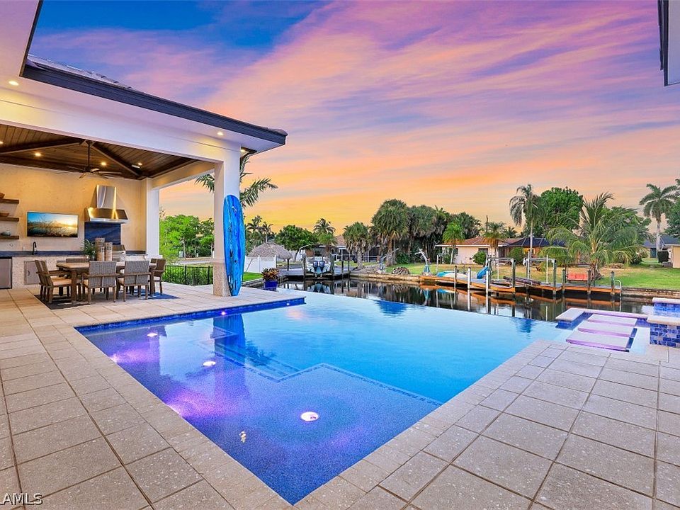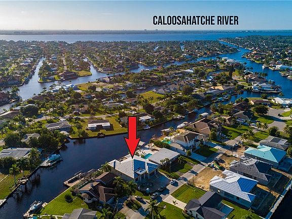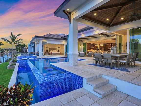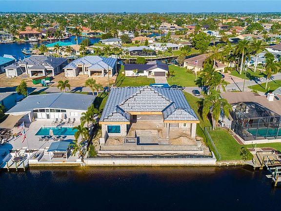 Photos are of model home. Under construction, custom built home on the widest (180 ft) part of the Saxony canal basin, w/ direct sailboat access within minutes to the river, & then out to Sanibel & Captiva Islands. Walk through the 11' custom iron and glass front door & see how this meticulous home epitomizes the SW FL indoor/outdoor lifestyle. Open plan Great Room w/ 13' ceilings. 10' impact sliding glass pocket doors lead you to the Cabana & outdoor kitchen, alongside a resort-style pool with a sun-shelf & spa to enjoy the warm sunshine. Entertain your friends in the beautiful kitchen or around an expansive quartz island. Premier quality custom cabinets, & premium stainless-steel appliances. Master bed w/ vaulted ceiling overlooks the pool & basin, w/ sliding glass doors to lanai. Luxury master bathroom includes a full bath, spa shower, & his and hers vanities. The two large Master walk-in closets have customized organizational storage systems. A “work-from-home” office with water-front view opens to the pool deck. The 2 spacious guest bedrooms have an on-suite bathroom w/ upgraded finishings. Some selections still available. This is a must-see property, changing daily.