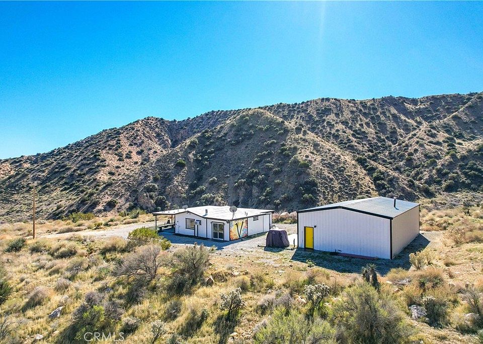 Discover a unique mid-century Western-style retreat on 5 private acres in scenic Morongo Valley, just 2 miles into Big Morongo Canyon. Perched atop a hill at the end of a solar-lit drive, this renovated home offers modern upgrades throughout. Expansive windows and sliders frame sweeping mountain views, while an open floor plan flows into a bright sunroom, library/office, bedroom, and a full bath. A 600 sq. ft. covered veranda provides stunning vistas by day and city lights by night. The wine frig is ready for you to keep a solid supply, so you are ready with a glass of wine for the sunset. The 1,500 sq. ft. warehouse/workshop is ideal for RVs, art studio, dirt toys, storage, or multiple vehicles. Enjoy solar-lit trails, a gazebo, fire pit, and tranquil streamside views. Just minutes from Joshua Tree and Palm Springs, and approx. 2 hours from L.A. Private showings only—please do not go to property without an agent.