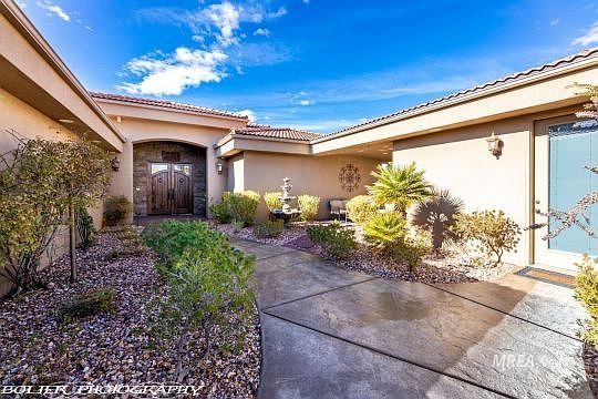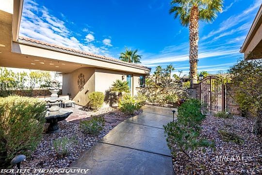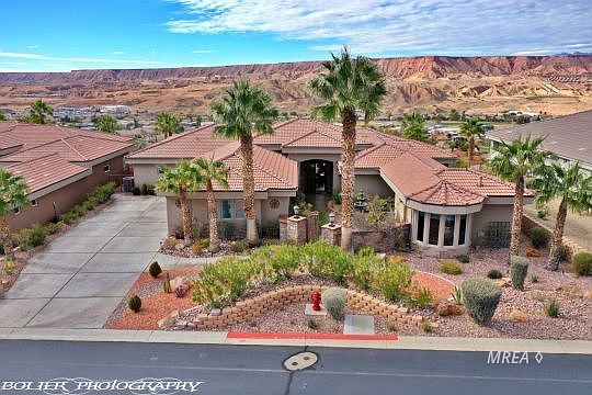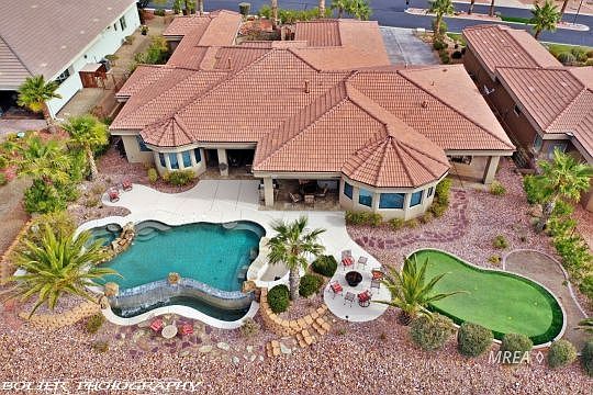 This exceptional custom home is located in one of Mesquite's most prestigious gated communities and is surrounded by the extraordinary Falcon Ridge Golf Course. Situated high above the city this home offers stunning views of Flat Top Mesa, the southern mountains and distant desert scape. On a .61 acre lot, this exquisite estate offers everything under the sun. The backyard Oasis has a negative edge swimming pool, raised hot tub, putting green, fireplace and ample patio space for endless entertaining. The back of the home opens to the outdoors with a multi-panel sliding glass door. The open concept floor plan is stately and beautifully appointed. The custom cabinetry throughout the home is stunning and the kitchen has Wolf appliances, decorative backsplash and granite tops. The wine cellar, wet bar and home theatre room are fun for gatherings and the spacious casita with a fireplace and kitchenette is perfect for guests. The master suite and bathroom are luxurious and lined with windows. The guest suite is on the opposite side of the home and has a private patio. The 3 car garage is close to a 1,000/sf offering plenty of room for vehicles and toys. This home comes furnished.