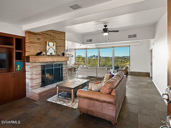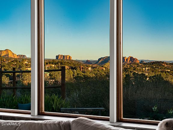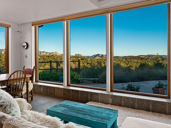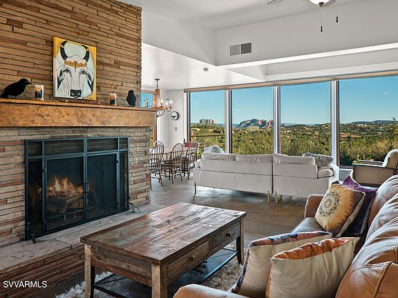 Rare Mid-Century Modern Gem! A private secluded sanctuary with epic views and horse property nestled in the historical Color Cove neighborhood. Step into this beautiful home and be transported to a light filled atmosphere of serenity and tranquility. This classic home boasts floor to ceiling windows that capture inspiring and stellar views of Thunder Mountain, Chimney Rock, Sugarloaf, Bell Rock, and Cathedral! This 2 bedroom, 2 bathroom home features an office and a massage room, perfect for a work-from-home setup or a relaxing retreat. The flagstone fireplace exudes warmth and charm, while the kitchen is equipped with granite countertops and stainless steel appliances for your culinary expression. Move outside onto the sprawling flagstone patios and take in the beauty of the gardens and surrounding landscape. The passive and active solar systems, the cisterns for rainwater harvesting, raised garden beds, along with the automatic drip system make this home eco-friendly and sustainable. The adorable 830 square foot Casita offers stunning red rock views and is perfect for hosting guests. The huge 2.5 acres of land is zoned for up to 4 horses, with a barn and corral ready for their arrival. This is a one of a kind horse property with No HOA restrictions. Short-term rentals are possible, Buyer to verify. This is the ultimate secluded oasis that offers everything you need to live the dream life in Sedona. Don't miss your chance to own this rare Mid-Century Modern Classic!