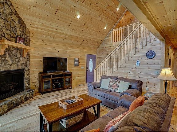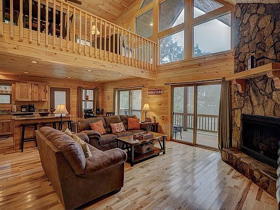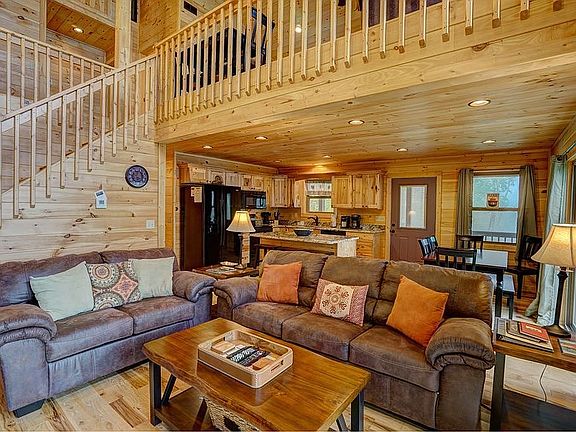 Enjoy top of the mountain views in this 4 bedroom 4 bath fully loaded vacation rental cabin! With no sheet rock anywhere, tongue & groove ceilings, this charming cabin has everything you want including 6.791 acres for PRIVACY. Main level features hardwood floors in the living area & ceramic flooring in the baths & laundry, stone gas-log fireplace in the spacious living room & walls of windows looking onto the covered porch & view! Spacious kitchen with granite counters, island with breakfast bar, ample cabinet & counter space & dining area that overlooks a long range mountain view. Main level features master bedroom with walk in closet & ensuite bath complete with walk in shower. Second bedroom on main level along with another full bathroom & laundry. Upper level features a spacious loft & is the perfect place for a recreation area. Upper master bedroom complete with ensuite bath & another large bedroom & full bath. Dual zone HVAC system (one for each floor) Enjoy sitting in the hot-tub on the covered porch overlooking the long range view or the spacious flat yard is a nice place to end the day around the firepit. Sold FULLY FURNISHED with an acceptable offer!