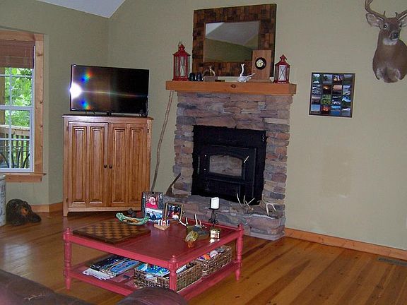 Gorgeous 2BR-2 Bath home built in 2008 with a nice wooded setting ! This home features a full unfinished basement for expansion or storage ( stubbed for another bath), wide plank hardwood floors, cathedral ceiling, front covered deck, awesome concrete poured dog lot with water for your pets, poured basement walls & 12 spots left in electric panel for future expansion if needed. This is a great starter home or seasonal home! A must see for buyers wanting a newer home! Only restriction is no mobile homes in this subdivision.