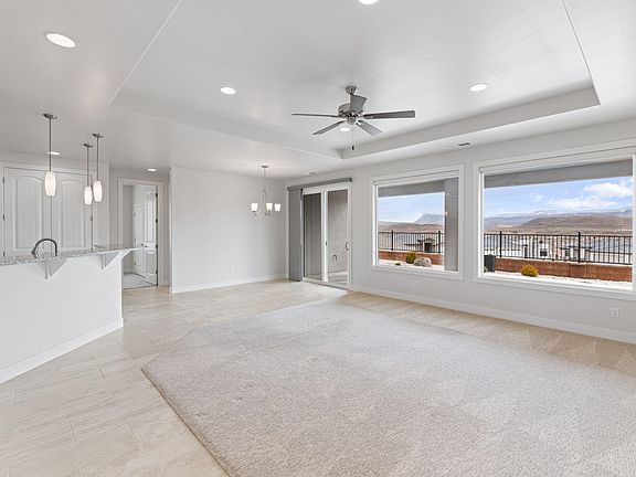 This Zion Vista home offers breathtaking views of Zion, Pine Valley, Monkey Mesa, and Downtown Hurricane from the back windows—truly a spectacular backdrop for daily living. Inside, the home is meticulously upgraded, with fully tiled showers in both bathrooms and a stylish tiled backsplash in the kitchen. All appliances are included, featuring an exterior-vented oven hood and a large refrigerator with a bottom freezer. Blinds adorn all windows and upgraded carpet ensures comfortability. The 2 1/2-car garage provides ample space for vehicles and storage, while the fully landscaped backyard is perfect for relaxing or entertaining, featuring a patio with paver bricks and an exterior gas line for grilling. The side of the house includes a paved RV/Boat pad with a security gate. The yard is fully fenced for privacy and security. The property is located within a private development where HOA dues include access to exclusive amenities such as a park with pickleball courts, a putting green, and a picnic pavilion.