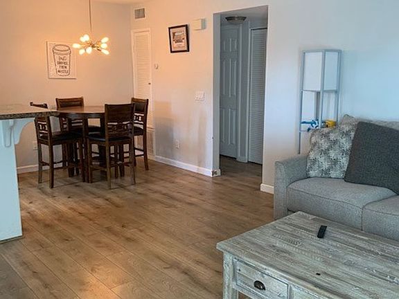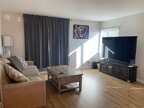 This unit is a corner condo and located close to your parking. New two tone gray & white paint, updated lighting fixtures, dual pane windows, and laminate flooring throughout the entire home. Spacious living room with sliding doors that open onto a private patio area. The kitchen has granite counters with breakfast bar area, stainless steel appliances, all white cabinetry, and plenty of windows for lots of natural light. As you pass by the open dining area, you head into the oversized bedroom with large window view and walk in closet. Conveniently, you have your own washer and dryer in the closet. The rent also includes water and trash. The community also has a large welcoming pool and jacuzzi with picini area to enjoy. This complex is also located close to shopping, transportation, restaurants and more. It does come with assigned parking and small pets are welcome with deposit. Please contact the agent below to schedule a showing. This unit will not last.