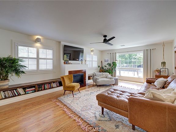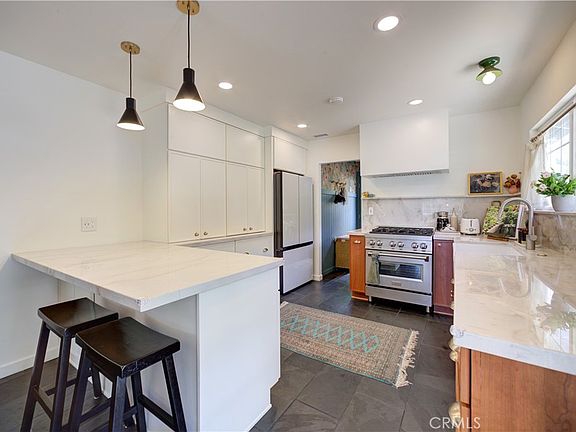 The inviting living room features original hardwood floors, a Fireclay tile fireplace with electric heater, and custom mid-century inspired built-ins, creating a warm and aesthetic space perfect for cozy evenings or entertaining. The chef’s kitchen impresses with new slate tile, quartzite stone countertops, soft-close drawers, rich cherry cabinetry, and a premium ZLINE gas range, seamlessly combining style and functionality. Both bathrooms have been elegantly remodeled with floor-to-ceiling tile and dual vanities, while the bedrooms feature mirrored closet doors with accent molding. Thoughtful finishing touches, including custom wallpaper and elevated light fixtures, enhance the home’s character and coastal appeal.