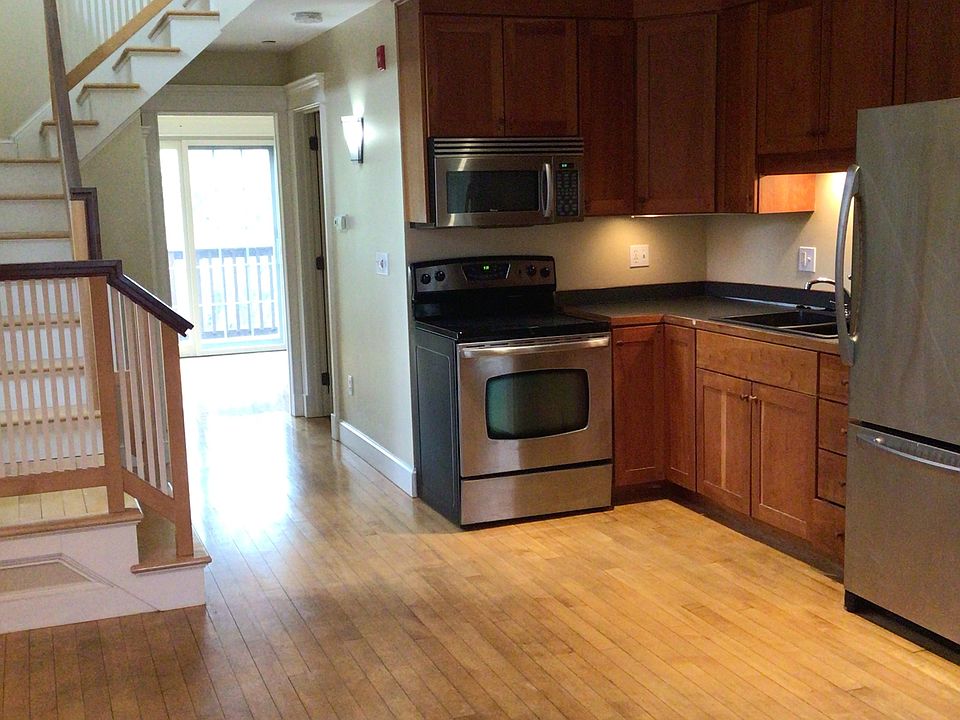 This end unit condo has south facing windows letting in lots of light. On the first level is the living room/kitchen which has an electric stove, refrigerator, and a good amount of cabinet space. Also on this level is a full bath and a bedroom with sliders out to a private deck. On the second level is an office nook, a half bath and a bedroom. There are wood floors throughout, gas heat and central air. Included in the rent is off street parking, snow removal, trash removal and a private storage room. Rental fee of 60% of one months rent with application if applying. If application is denied the fee is returned in full. Landlord takes first and last for move in (no last).