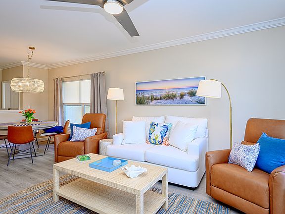 This beautiful first floor luxury end unit is newly updated in 2025 with all new furnishings, including top-of-the-line mattresses, pillows, and linens. The freshly painted unit is light and airy with lots of natural sunlight and a beautiful view of the lake. It boasts two outdoor seating areas with a screened-in lanai on the lake and a courtyard off the kitchen for maximum outdoor enjoyment and relaxation. A deck box is provided for you in the courtyard with new beach chairs, an umbrella, and a beach cart. Bicycles are also available for your recreation.