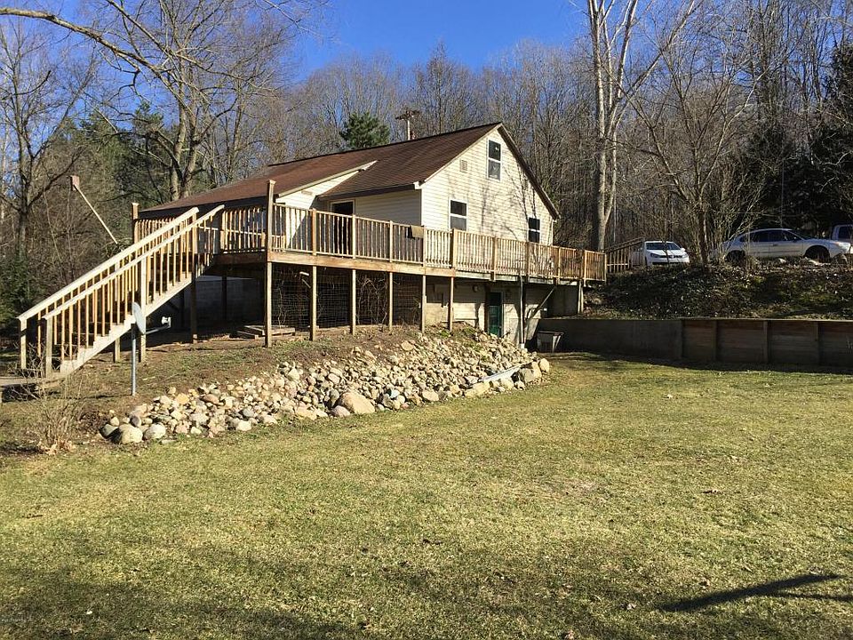 This is a great starter home that is almost completely surrounded by state land that goes all the way down to the Grand River. Open floor plan, main level laundry. Massive back deck to continue entertaining your guests or find your way down to the fire pit in your back yard. Chicken fencing under the deck if you want to raise your own chickens (can be removed if not wanted).The upstairs bedrooms are non-conforming but have been used this way for years. This efficiently sized home will keep your utilities low especially if you use the brand new pellet burner. Propane is cheap now but it may change. Come take a look at the possibilities this property possesses.