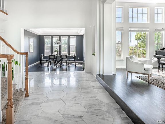 Alluring elegance cascades throughout this pristine Pradera home poised on an expansive corner lot. Residents are drawn inward to a grand 2-story foyer flaunting an elegant staircase and new marble tile. Refinished dark stained wood flooring flows gracefully underfoot as soaring ceilings expand the scale of the home further. Natural light from floor-to-ceiling windows illuminates a great room grounded by a fireplace. A formal dining room sets the stage for at-home entertaining while a vast wall of windows in a living area peer out over the horizon. The home chef delights in a spacious kitchen with large pantry and featuring a center island and abundant cabinetry. The main level is complete w/ a private home office and main level laundry. Upstairs, a flexible loft area leads into a primary suite w/ a spa-like bath and huge walk-in closet. A secondary en-suite bedroom offers a guest retreat while two additional bedrooms both w/ large walk-in closets are complemented by a shared bath with double vanity. Enjoy outdoor relaxation in a landscaped backyard featuring a large deck, patio, basketball court and a concrete flat. A large unfinished walkout basement w/ rough-in plumbing is waiting for your imagination! Perfect for a movie theatre, extra living space, a gym, whatever your heart desires! The Pradera community offers a clubhouse with a pool, tons of trails and parks surrounding. There is a gorgeous private golf club in the community where you can secure a membership to enjoy golf at an award winning course. Home is only a 15 minute drive to the fun and exciting Downtown Parker.