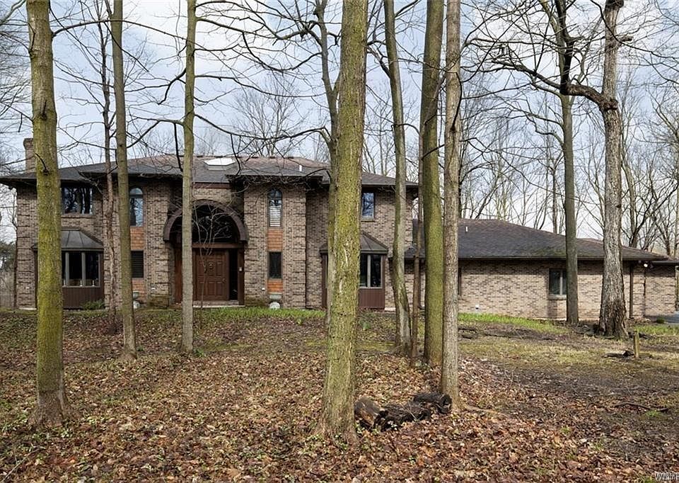 Located just minutes from the Town of Clarence in exclusive Clarence Hollow. This custom builder's original designed home is perched atop the historic Onandaga escarpment. Reminiscent of a Vermont-style chateau, this all brick home sits on a 1.6 acre secluded wooded lot. The 2 story foyer boasts a marble entry, floating circular oak staircase & skylight. The 30 foot Great Room is open to the kitchen & features an Amish Autumn Bled Limestone woodburning fireplace & 18 foot peaked Knotty pine ceiling w/all glass rear wall. Copper awnings, generator, the list goes on.....