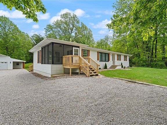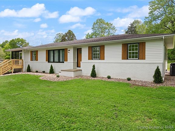 Looking for your dream home with extra space? This beautifully renovated one level ranch is move-in ready, just waiting for its new owner! Spanning over 2,400 square feet, this expansive residence features 4 spacious bedrooms, 3 full baths & 2 versatile bonus rooms situated on nearly 3 acres. This property offers multiple entertainment options, including a screened-in porch, two back decks & a covered patio attached to the detached garage—ideal for creating your personal outdoor oasis. Enjoy the convenience of two bedrooms with private full bathrooms, including a generously-sized owner's suite. The second en-suite bedroom is situated at the opposite end of the house for added privacy. The oversized 32x16 detached garage is not only heated but also includes a designated workshop area along with the attached covered patio. Home is surrounded by beautiful landscaping. The exterior features a conveniently located crawl space entrance with a full-sized door, complete with a moisture barrier and new spray foam insulation for peace of mind. This property boasts a convenient location on the edge of town, offering a short drive to Corydon and I-64. It's also within 5 minutes of the new Lanesville interchange, providing quick access to I-64 & Amazon and just 10 minutes from Georgetown. Louisville is less than a 30-minute drive away. Don’t miss the chance to make this expansive, move-in ready home your own! Some photos are virtually staged. Seller is a licensed real estate agent.