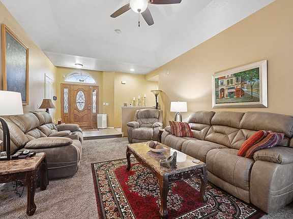 This appealing One Level home has character inside and out, including high roof lines with new composition roof recently installed. The inviting arched entry brings you into a large great room with coffered ceilings and gas fireplace. A well-designed kitchen is loaded with cabinetry including pull-out shelving, granite counters, a pantry, stainless appliances, and center island. The dining area has sliders opening out to a 16'x 23' covered patio and a nicely landscaped backyard with small garden area and framed utility building. The spacious primary bedroom has coffered ceilings, a walk-in closet, bath with large tiled shower, and sliders leading out to a 12'x 12' covered patio with 8-person hot tub. One of the BEST FEATURES of this property is the deep RV parking area at the back of the lot directly accessed off the side street. An attractive property in a wonderful suburban neighborhood!