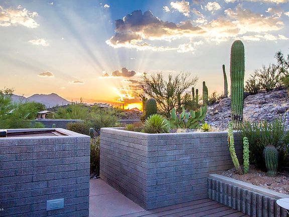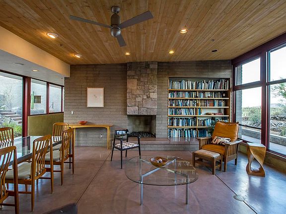 DESERT MODERN..... Nestled in the saddle of the hill of volcanic rhyolite bedrock.... designed by Architect Wilson Peterson. He sourced local artisans, tradespeople and craftsmen to create this home. Made for modern desert living incorporating the INDOORS AND OUTDOORS-----from the large picture window looking out over the Tucson Valley you can watch the drama of the monsoon storms roll in, catch a summer lighting display or the waterfall created by the butterfly roof. The telescoping glass patio doors on to the central courtyard bring nature in and living out. Each room provides a doorway to embrace the desert surrounding. Stairways that lead out to nature or up to the observation deck with 360 views.