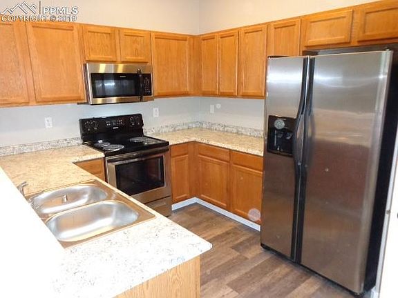 NEWLY REMODELED HOME. Two master suites on upper level. West facing upper bedroom walks out to a 25 x 8 wooden deck with exceptional mountain views. Gas fireplace, stainless steel kitchen appliances, washer and dryer provided. Detached garage with garage opener, fenced area for pet or kids. No maintenance yard. Trash service and bin included in rental. Neighborhood is next to city park. Easy commute to Powers Blvd.