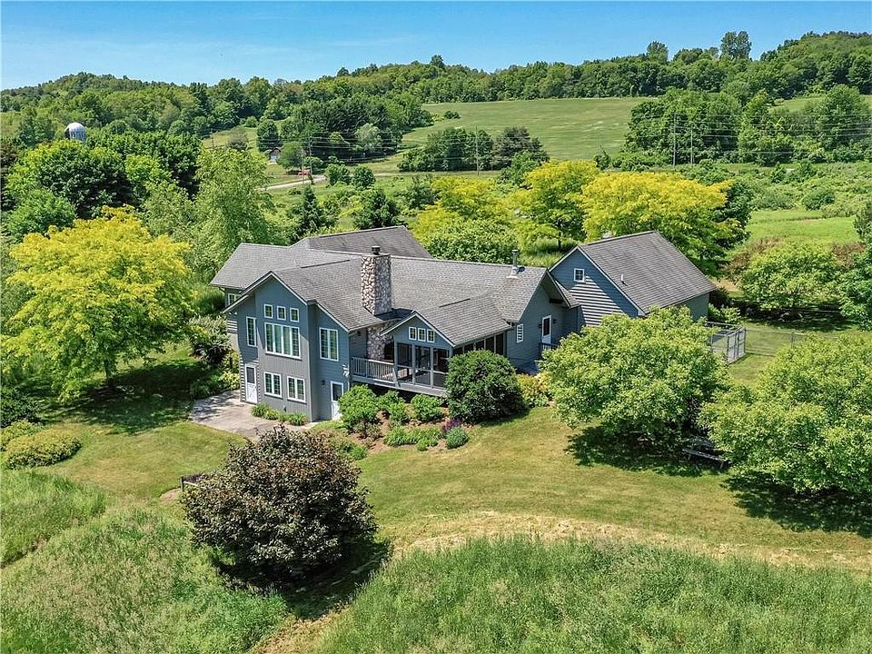 Meticulous country residence set on private, tranquil 10.6 acres with panoramic views of surrounding hills and Canandaigua Lake! Post and Beam custom-built in 1999 by New Energy Works. Ranch floor plan with generous great room, granite cook's kitchen, dining room with custom caseworks, sun room, and primary suite. Finished, walkout terrace level with family/rec room, 2 additional bedrooms and full bathroom. Warm wood interior includes reclaimed Doug Fir beams and woodwork, custom cherry cabinets & bookcases. Cherry & slate floors. Cathedral ceiling and handsome stone fireplace grace the great room with over-sized windows facing the Lake! Cedar finished screened porch & deck off kitchen. Front porch to enjoy evenings and sunsets. Large storage shed. Fenced side yard and double kennel extend from attached 2.5 car garage. Central A/C, security system, generator. Meandering walking trails throughout the property for birding and enjoying wildlife up close! Near to Canandaigua Lake parks, marina, Bristol Mountain & Hunt Hollow skiing. A fine combination of quality home & idyllic setting in the Heart of the Finger Lakes Region! Shown by appointment only.