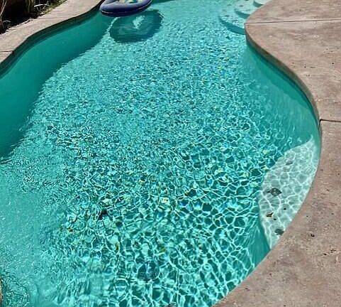 Beautiful Pool Home with perfect Split floor plan. 3-Bedrooms on North Side and 1-Bedroom on South Side with a conveniently located bathroom. This room could make a Great Family room, as well. Laundry room is located close to Kitchen. Warm living room fireplace. Cathedral Ceilings, bull nosed corners. Home is sold as-is, but not beat up, or excessive wear and tear. Master walk-in closet, double vanity, tub shower combo. Hop, skip & jump and splash into a like new sparkling swimming pool, or soak away sore muscle in the in ground hot tub.