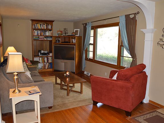 Cozy home with Personality! Woods Floors in Living Room, Dining Room and Bedrooms! Yes...Formal Dining Room and an eat in kitchen! Built in Bar in Kitchen - with Look Through to Living Room! Gas Stove! Refrigerator with Icemaker remains with property! Full basement - with painted walls and Washer & Dryer that stays! One Car Garage with Opener! Patio and Deck off kitchen and a HUGE Fenced in Back Yard! Wonderful yard!