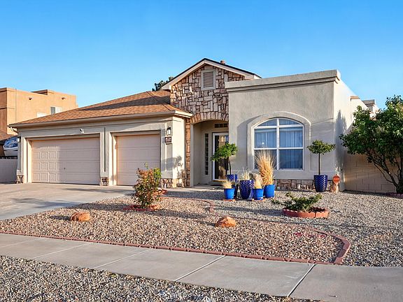 Welcome to this beautifully maintained single-level home in the Enchanted Hills neighborhood! The versatile floor plan offers 2 living areas or use one as an office or formal dining space. Step inside & discover thoughtful upgrades throughout, including a newer roof & stucco (23), a water softener, walk-in bathtub & reverse osmosis system for pristine drinking water. The heart of the home is both functional & welcoming, perfect for everyday living or entertaining. The 3-car garage provides ample space for vehicles, storage, etc. Outside, enjoy low-maintenance living with turf landscaping, a covered patio ideal for relaxing or hosting, & 2 storage sheds. Soak in the stunning views of the Sandia Mountains from your own backyard retreat. Move-in ready! Don't miss this well-cared-for beauty!
