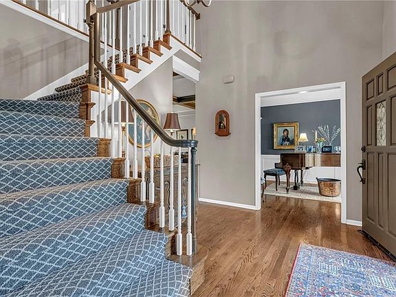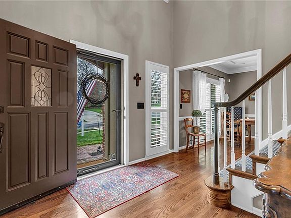 This Highly sought after Carriage Crossing home! A STUNNING and lovely, traditional 2-story you really must view! Beautiful features throughout such as hardwood floors, plantation shutters and a Butler's pantry in the kitchen. The Fabulous backyard offers a lush view with gorgeous landscaping and a water feature...a huge deck and an architectual brick patio. The interior is bright and beautiful and offers a den for gatherings or home office...lovely views from most rooms and magnificent kitchen with updates, island and butler style pantry. All of the spacious bedrooms are located on the upper level and the main features a cozy sitting room and large generous bath and closet. The finished lower daylight level offers a large family/rec style room and additional space for home gym, office or play area and half bath. Located moments from highly rated schools, shopping, entertainment, restaurants and golf...you'll be ready to make this one your own.