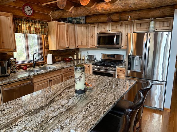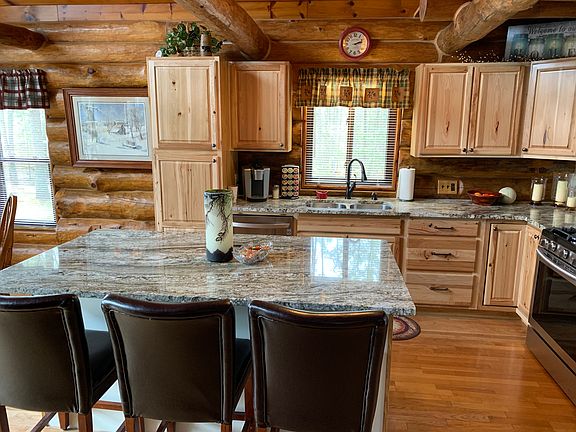 This Full Log Home built in 2001 is located just 4 miles north of Rhinelander with 5 acres of wooded privacy on a dead-end road. The great room features a fieldstone wood burning fireplace, cathedral pine ceilings with log beams, & a wall of windows with patio door leading to the 10 ft. wide deck & covered porch. There is a brand new kitchen with new hickory cabinets , granite countertops and all new stainless steel appliances. There are two main floor bedrooms with logs on exterior walls and a full bath to complete the main floor. The upstairs includes a loft area perfect for your morning coffee and a spacious bedroom with built in dressers. The basement is completely finished with a family room, full bath, office, den & laundry room which is cozy warm with 3 zones of in floor heat in this home. There is a detached 24x36 2 plus car insulated and heated garage, a storage shed with attached wood shed. apple trees and maple trees. If this home interests you, Please call 715-499-2641