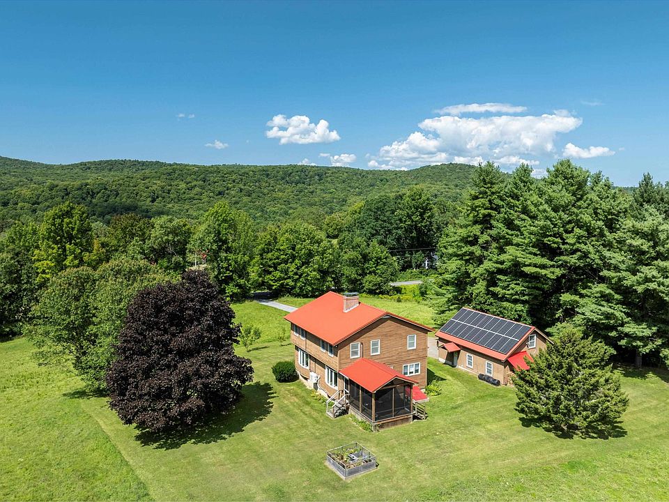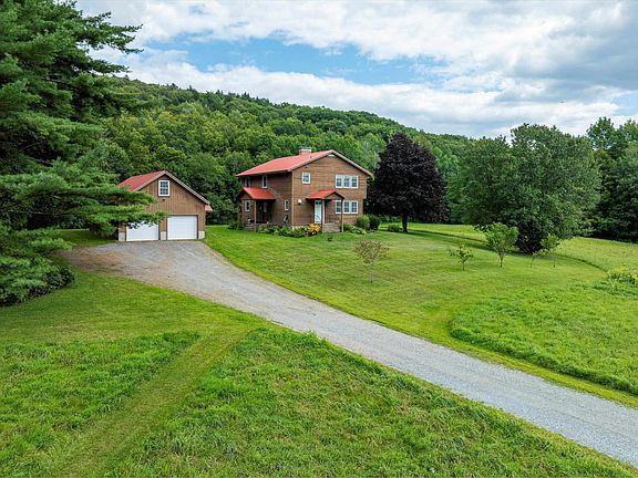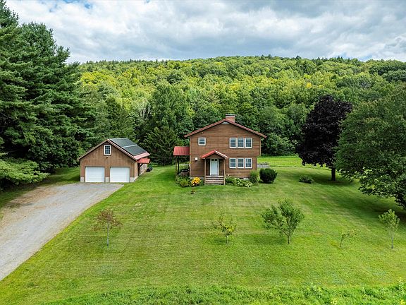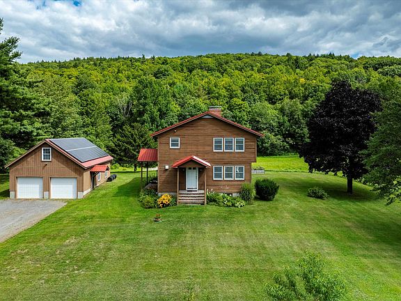 Surrounded by nearly 20 acres of open meadows and mature forest, this attractive 2-story house benefits from southern exposure, views of distant hills and beautiful sunsets. The interior offers an open concept living, kitchen and dining area, enhanced by hardwood and tile floors and a brick fireplace with wood stove as the focal point in the living room. Mudroom/foyer and half-bath complement the first floor. Upstairs there are 4 bedrooms and a large bath. Additionally, there is a full basement with a laundry area and second wood stove. A private screened porch, accessed from glass doors in the dining room, is a perfect place to enjoy a breathtaking view, birds and wildlife. Upgrades include solar panels, heat pump mini-split system for heat and AC, heat pump hot water heater, and *Tesla Powerwalls for backup power. A 2-car garage includes a second floor for storage space. A labyrinth, created by the current owner, is a place for walking meditation and enjoying nature. Landscaping includes established perennial flower beds, a small orchard, and a raised-bed vegetable garden. Located just a mile from the Westminster West village, 4 miles from Saxtons River and 8 miles to Putney, with easy access to I-91 and NH. Showings begin Sept 7th.