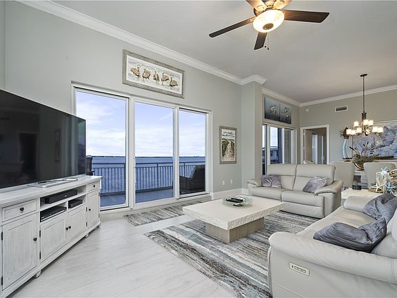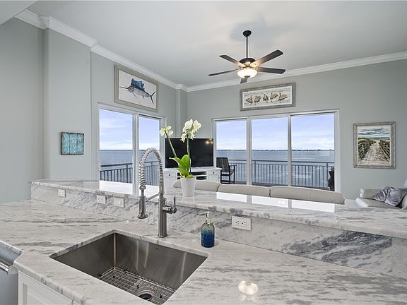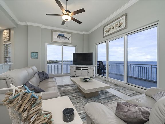 2025 HOA Dues paid. Imagine a coastal penthouse condo that has been completely updated with the finest finishes and thoughtful design. 13’ ceilings throughout the unit offering expansive River views with a wall of sliders that lead you onto your private wrap around balcony. Chefs kitchen is equipped with Viking appliances, Dolomite counters, Prep sink, and a large walk in pantry. Custom bar with wine/beverage cooler. Family/Media room has custom built in storage and corner cabinet and shiplap wall. All appliances, HVAC, water heater, and electrical panel have been recently replaced.