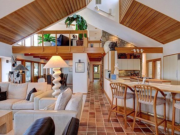 Artfully crafted and seated within the cliffs of Catawba Island, this 3,650 sq ft lakefront home is a must see! Only one of a dozen estates on Lake Erie within the gated community of the Catawba Cliffs, this property showcases modern architecture while still preserving the rich history of Catawba Island. Designed by distinguished artist and architect Harold Roe. The interior's multi-level panoramic views, spacious living areas, grand foyer, and two-story all seasons room are only the beginning of the magnificent amenities. Three vast bedrooms, including a master en suite, four bathrooms, loft, wine cellar, wood burning fireplace, open atrium style staircase, exercise room, & distinctive details of marble, vaulted ceilings, expansive windows, Mexican quarry tile, and exposed stone walls add to the spectacular layout and features of the property. On the grounds, you will find a unique bridged walkway to enter the premises, dual level deck, stunning landscaping, original limestone, beautifully wooded neighborhood, and a private beach all to call your own. The estate is situated near the Catawba Island Club, Miller Ferry, and is a short boat ride to the islands. Whether you are seeking a summer getaway or full-time residence, this Catawba Cliffs masterpiece is a must see!