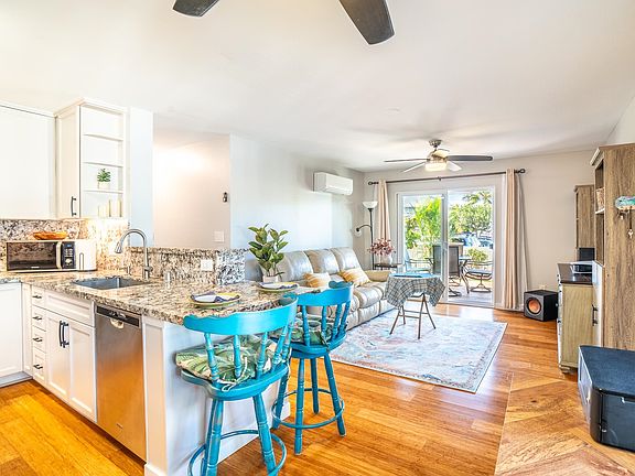 Beautiful, fresh and classy! This renovated GROUND floor unit in the heart of Napili is move-in ready. The 2nd bathroom has been converted to a full bath with a walk-in shower. Amazing attention to detail with an extra large soaker tub in the 1st bathroom, split zone a/c with units in the living room and primary bedroom. All new top of the line windows and doors. Spacious garden area with patio and extra storage. Completely upgraded recently inside and out including new... appliances, cabinets, marble countertops, hardwood flooring, paint, trim, keyless entry, water heater, outlets, switches, electric panel, bathrooms, ceiling fans and lanai sunshades. The exterior of the complex has new paint, roofs and gutters. Easy to show! One of the seller's has an inactive real estate license in HI.