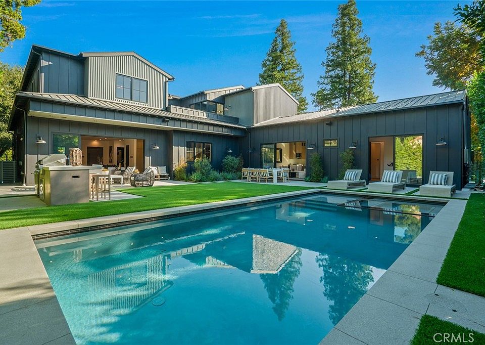 One of a kind modern home, brand new construction in the heart of Encino. This breathtaking masterpiece sits on a great lot with gorgeous curb appeal. Experience luxury indoor/outdoor living in this completely reimagined smart home with approximately 5300 SQ FT of elegance. Step in to find a bright open floor plan brimming with designer features including wide plank wood flooring and handcrafted woodwork and shelving. Home features a smart home system with speakers, cameras, alarm and much more. Entertain in the world-class chef’s kitchen with seated island with quartz countertop, wine storage and high end Thermador appliances. Unwind in the living room with a fireplace, or host soirees in the gorgeous dining room. Upstairs you’ll find the spa-inspired spacious primary suite with his and hers walk-in closet, sitting area, soaking tub, walk-in rain shower, and balcony ideal for evening refreshments. Enjoy endless sunsets outside on the grounds with pool, BBQ, and outdoor dining area. Outdoor ADU offers 880 Sq Ft which includes a kitchen, living room, two bedrooms and a full bathroom. Security cameras and security gates offer total serenity and privacy.