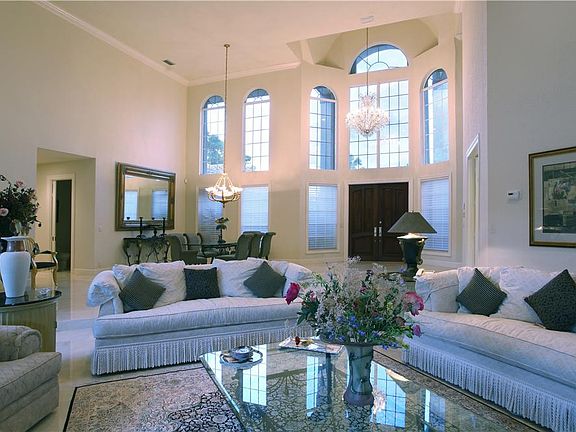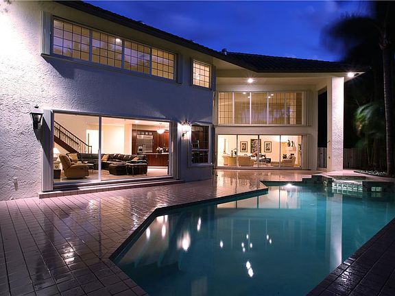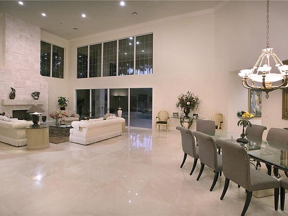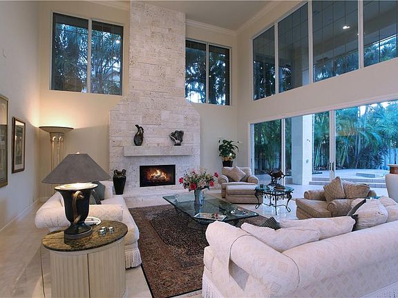 Blending drama and warmth, stunning double-height living spaces are at the heart of this elegantly renovated showplace in The Sanctuary's idyllic seclusion. Set behind the guarded gates of The Sanctuary in a groomed tropical landscape, this recently renovated estate gives a stunning contemporary take on traditional Mediterranean design. Choreographed with airy spans of glass and polished sweeps of creamy marble, the sleekly sculpted double-height living areas strike a perfect balance of drama and warmth, sophistication and ease. Throughout the formal and informal spaces, the flow is open and effortless, transitioning onto the glamorous pool patio embraced by palm trees. This is not only a showplace for entertaining, but an eminently comfortable abode for everyday living. A luxurious first-floor master suite is featured, with three more bedrooms placed apart in another wing on this level. Comprising the entire upper level, separate self-contained living quarters offer exceptional versatility for family, guests, or staff. Adding to the appeal of this standout estate home are the privacy, quietude and prestige of Boca Raton's world-class yachting enclave. Location Sanctuary Lane, Boca Raton, Florida. Boca Raton's internationally acclaimed yachting enclave, The Sanctuary offers exclusive amenities including a 20-slip marina, Har-Tru tennis courts, and a pristine 27-acre bird/wildlife preserve – all in the privacy of a 24-hour guard-gated entry plus the community's own road and water patrols. Minutes from the beach, this sought-after address offers a short drive to the legendary Boca Raton Resort & Club, Mizner Park's world-class shops and restaurants, and Boca Raton's private executive airport. Property An impressive estate setting on lushly manicured grounds establishes the tone of this stunning Contemporary Mediterranean residence. From the sweeping motor court, a landscaped walkway ushers guests to the formal entrance under a monumental archway. Window walls open the west exposure of the residence to the privately fenced, tiered patio, where the custom-designed pool features a spillover spa with night-lit glass block edging. Yacht dockage is additionally available at The Sanctuary marina. Residence Stylishly renovated, this elegant residence is comfortably scaled in a total of 6,819± square feet with light-filled open-plan living spaces, 5 bedrooms, 4 full baths, 2 powder rooms, and a 3-bay garage. The windows and exterior doors are protected by storm shutters. Main Level: Inside the grand double-door entry, 2-story ceilings heighten the drama of the open foyer and main living areas, all set off by clean architectural lines and polished cream-toned marble floors. Natural light streams in through soaring double-tiered windows and spans of sliding glass doors flowing to the loggia and pool patio. The striking centerpiece of the formal living area is a soaring floor-to-ceiling fireplace clad in textured coral. The open formal dining room is also part of this grand entertaining space. A guest powder room is situated across the hall. There is also a library with an adjoining powder room that doubles as the cabana bath. A statement of modern elegance, the sleek new gourmet kitchen combines rich ebony-hued cabinetry, polished granite counters, and gleaming stainless steel appliances. Bringing in views of the pool and tropical foliage, large windows and sliding glass doors stretch across the airy open breakfast area and generously sized 2-story family room, the focus for informal living and entertaining, with a seamless flow to the pool patio. Next to the library, the private master suite is beautifully scaled and features his-and-her walk-in closets in addition to a luxurious his-and-her marble bath – a spa-style retreat with glass-enclosed walk-in shower and jetted tub in a glass-block-windowed alcove. Placed apart from the master suite, the second bedroom also offers an en-suite bath. The third and fourth bedrooms are served by a co