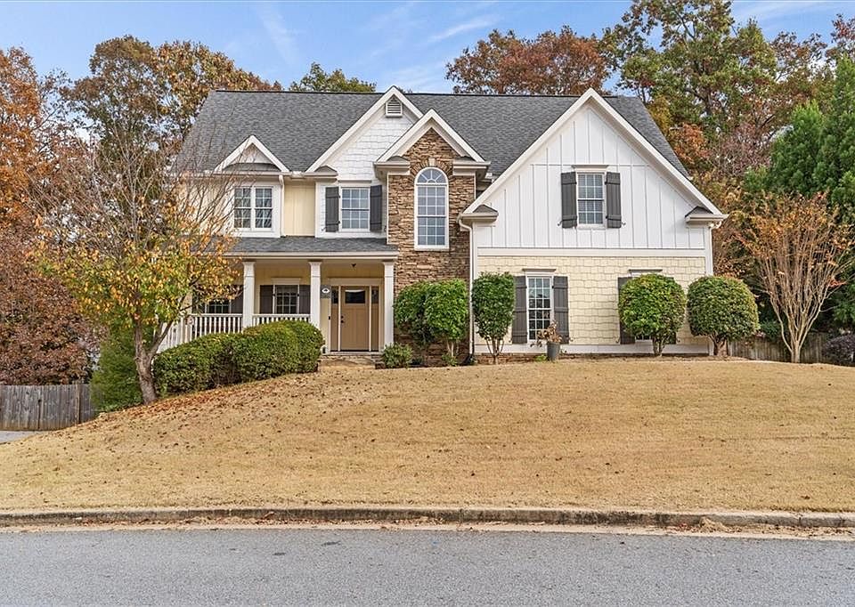 Beautiful Craftsman stately home with 3 levels of gorgeous finished living space on culdesac lot with level fenced backyard with firepit area and top of the line finished terrace level which walks out to the wonderful backyard space. Enter the home with this covered front porch and into the beautiful front entry. Two story grand family room with updated fireplace with sought after tile finish and farm wood mantel. Newly refinished hardwood floors throughout the main level. Open concept kitchen with refinished cabinets, stone counters, pantry and loads of counter space. Spacious dining room with barwood accent doors which can make a great office space as well. The breakfast nook off the kitchen offers loads of space. Walk out to the upper deck for perfect entertaining and outdoor grilling. You will love the upgrades in this home with its built in desk and organizer plus the hall tree and shoe storage built in for the organized user. The main level has a guest bed & bath. The open staircase to the upper level is a showstopper and the abundance of light in this home creates a happy place to call your own. The upper level has french door entry into the large master suite with trey ceiling accents and its updated master bathroom. Secondary bedrooms are spacious and have access to a bathroom. The terrace level was professionally finished with its guest room, workout room, dining area, tv space and an amazing full bar for great entertaining. The terrace level is light filled and feels just like the upper level of the home with its top of the line finishings. The upgraded terrace level flooring is a beautiful sight. The true hang out spot. Top rated schools and close to interstate 575 for easy commute to Atlanta with the Peach Pass.