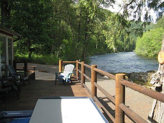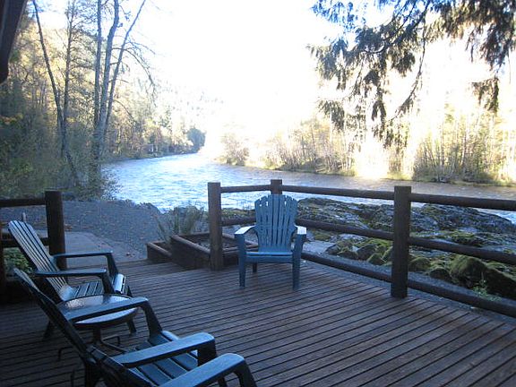 If you are a fisher person or have traveled the McKenzie River Recreational Valley at any time in your life you would have heard of Prince Helfrich. The Helfrich family has lived and fished this river for many generations. This adorable, cozy and charming cabin was once a home to Prince. With many changes in the river over the years the cabin now has 150 feet of beautiful river frontage at Clover Point Rapids. Walls of windows show off the fabulous river views from the living room, kitchen and master bedroom. There is a large deck off of the living room for entertaining year round. A wood burning fireplace in the living room is a place you will enjoy cuddling up to with a good book. The master bedroom has a slider that leads on to the river deck with a sunken hot tub to enjoy on those star lit nights glistening over the river. Formal dining room for serving up the fresh fish you just caught from the rivers edge in your own back yard. Large boulders and rip rap secure the river bank. The east side of the house has a court yard with raised garden beds, gets lots of sunshine and leads to the concrete steps and pathway to the river. Covered patio area, fenced area for animals or kids to play safely. Large parking area with pull through driveway for easy access in and out for boats or RV's. This is a perfect vacation retreat for the whole family or live here year round and enjoy the easy commute to town out of the valley fog. ~ This is a real keeper, don't let this one get away ~
