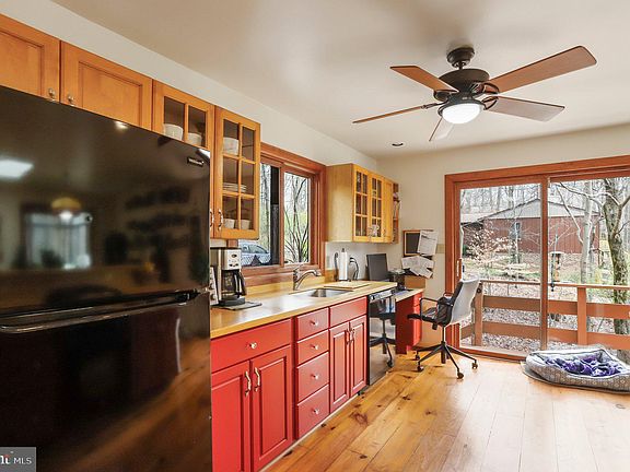 Nestled on a serene wooded lot, this contemporary rancher exudes a harmonious blend of natural beauty and modern living. Step inside to discover an expansive great room, the heart of the home integrating style and functionality. Wood floors throughout main level add warmth and beauty. Lots of natural lighting from large windows and skylights, cathedral ceilings and soft recessing lighting. Modern cooks' kitchen with all appliances including gas cooktop. Sun room addition (2021) beckons with panoramic view of the outdoors, a peaceful sanctuary year-round. Daylight lower level has cozy family room, 2nd bedroom, bathroom, and 3rd bedroom/craft room and separate laundry/storage room. Bask in natures beauty from the side deck, while entertaining guests or simply enjoy al fresco dining amidst a tranquil setting. Features 2,156 sq ft finished living space, new roof 2024, new heat pump 2023, flue on each level. Almost one acre lot in Mount Zion Estates, conveniently located and just minutes to everything. This home offers the ultimate escape from the hustle bustle of everyday life. Your home sweet home awaits.
