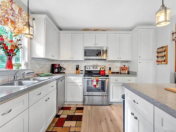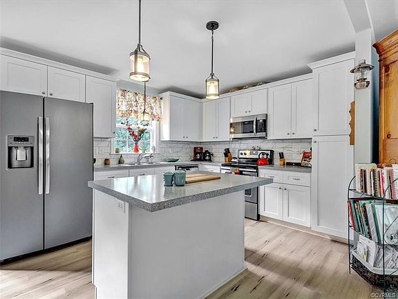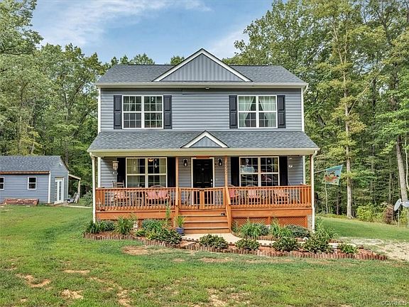 Beautiful Two-Story Transitional Sitting on Expansive 4.38 Acre Private Lot in Goochland! This stunning property features 3 BR, 2.5 BA, 1,480 sq ft, open floor plan and tons of land to optimize this spacious land. Be welcomed by a full country porch inviting inside a stellar floor plan. Living spaces conveniently flow, ideal for entertaining family and friends. Updated kitchen offers center island w/bar-seating, SS appliances, tile backsplash and stylish cabinets. Dining area opens flawlessly to expansive family room with powder room just around the corner. Retreat upstairs to a fabulous primary suite providing a huge walk-in closet and private en suite with separate vanities. Additional two bedrooms offer spacious closets, sharing a full hall bath with tub/shower combo. Don't miss out on the incredible backyard retreat, flaunting large deck and tons of privacy from surrounding trees. Storage is a breeze with access panel to above attic and large detached storage shed. Property is conveniently located in the heart of Goochland County with easy access to popular shopping and dining & just a short drive to major highways and Downtown Richmond!