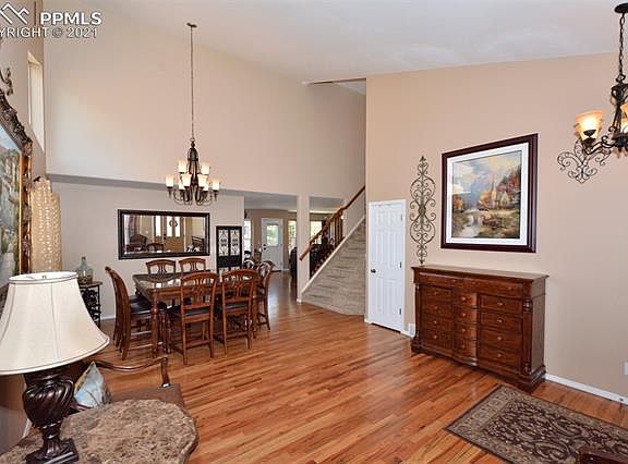 This home is situated on a quiet street with mountain views and features a stucco and brick exterior with mature trees and a landscaped front yard. Inside, you'll find a spacious great room that can be used as a sitting area and formal dining room, or a second living area. Stunning hardwood flooring, vaulted ceilings, dimmer light switches, and two custom chandeliers make this an elegant space. The kitchen features granite island and counters, ample cabinet space, stainless steel appliances, mosaic backsplash, and hardwood floors. It also has recessed lighting and a custom chandelier. The eat-in area has a lovely bay window and additional chandelier lighting. The open concept layout flows into the living room, where you can cuddle up near the stacked stone gas fireplace and enjoy views of the landscaped backyard. From here, you can also access the 2 car garage, the powder room with granite countertops that leads into the laundry room, or the carpeted basement which has 2 additional bedrooms, a family room, an additional bathroom with shower/tub combo and granite counters, and a large unfinished storage space. The back yard has been professionally landscaped and is an outdoor oasis featuring a stone waterfall that trickles down into a manmade pond and a built in fire pit. Heading up the stairs which have wrought iron details, you'll find the spacious master bedroom with vaulted ceilings and double barn doors leading to the en-suite bathroom, and another stone, gas fireplace. The en-suite bathroom has tile floors, shower and countertops, a built in vanity, a soaking tub, a 2nd sink, and walk in closet. Down the hall are 3 additional large bedrooms with carpet, two of which have walk-in closets, another bathroom with granite counters and a shower/tub combo. This home is located in the Wagon Trails neighborhood in north Colorado Springs, with quick access to Austin Bluffs and Dublin, the Air Force Academy, Peterson AFB, nearby shopping, entertainment, and restaurants.