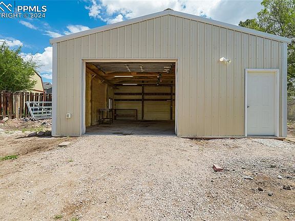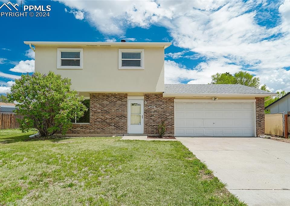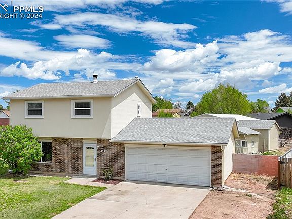 10,000 Sq.Ft. lot with detached Workshop/3+Car Garage Outbuilding (29x23 sq.ft.). Great 2-Story Home with upgraded low-maintenance stucco siding (NEW 2021) and upgraded electrical panel (NEW 2018). Fresh interior paint (NEW 2024). NEW carpet on stairs and NEW interior doors/doorknobs on bedrooms/baths (2024). Wood laminate flooring throughout most of the home (NEW in 2020 and 2022). Eat-in Kitchen includes a stainless steel refrigerator, gas range/oven, dishwasher, ceiling fan with lights, and an eating nook area, plus door to backyard. The nicely-sized Living Room features a wood-burning stove, wood laminate flooring, faux wood blinds and a large window looking out at the beautiful lilac tree in the front yard. The Powder Room/Laundry Room is light and bright with an updated vanity with composite countertop, a built-in medicine cabinet, and the washer and dryer are included. Upstairs are three bedrooms with laminate flooring and ceiling fans, and a 3/4 Bath featuring a double vanity with updated countertop, walk-in shower with upgraded shower insert and specialized sprayer system, tile flooring and linen shelves behind door. Mountain views from bedrooms 2 and 3! Nice decorative touches include iron railings at the stairs and a tile deco wall in the main level bath. Central Air Conditioning. The detached outbuilding/garage was built in 2018, is insulated and includes 220 electric service (there is a drive-thru side gate to backyard). Great potential for outdoor entertaining and play space in this huge backyard with 16x10 concrete and pavestone patio, plus separate 16x16 concrete pad, ideal for future above-ground swimming pool or basketball hoop, etc. Plus exterior gas hookup for grill. Additional features include a Ring doorbell, storage shed, playhouse, and tons of space for gardening and more! Located in a cul-de-sac on a low-traffic street, just one block from Penstemon Park with playground. Easy access to Powers Blvd and military installations. Great property!